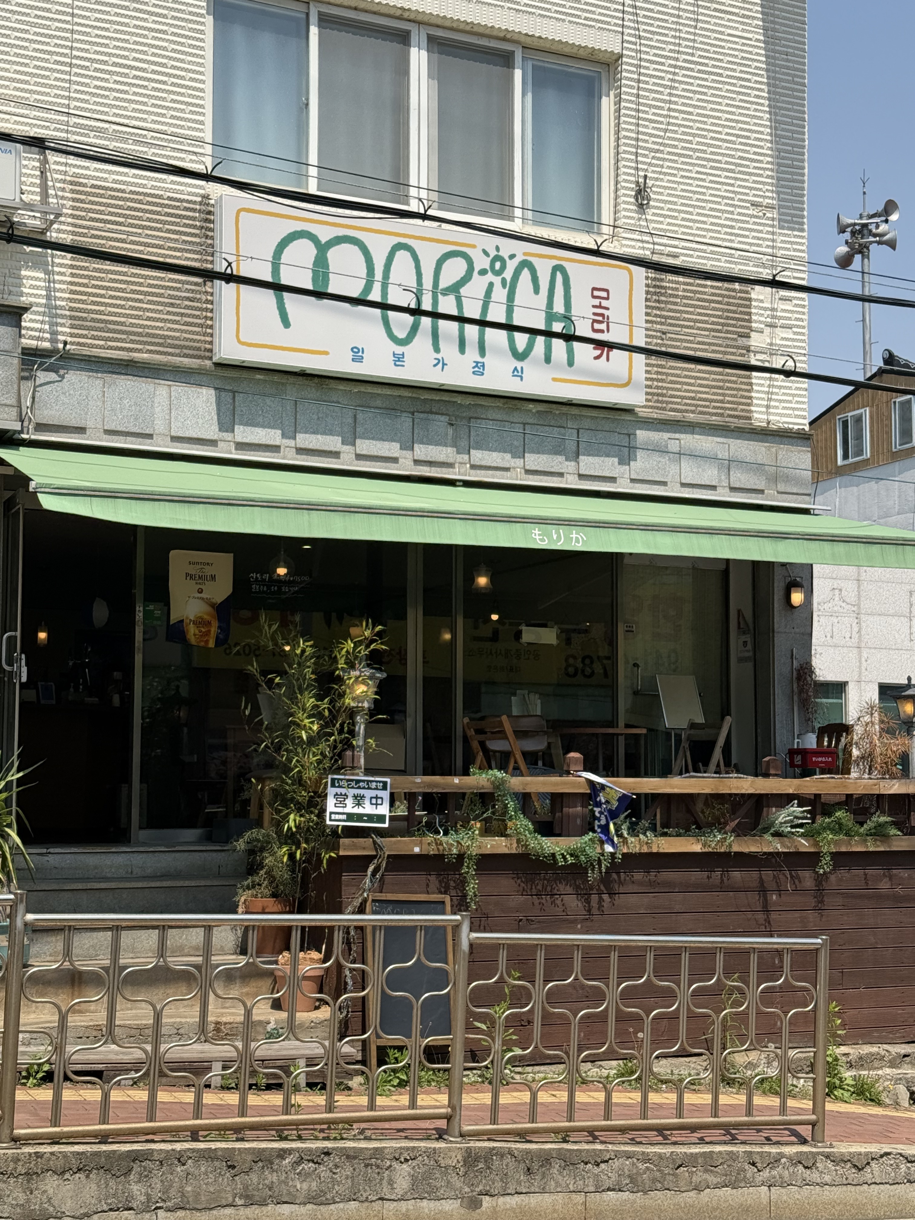 초록 어닝이 달린 일본 가정식당 모리카 가 보여요!